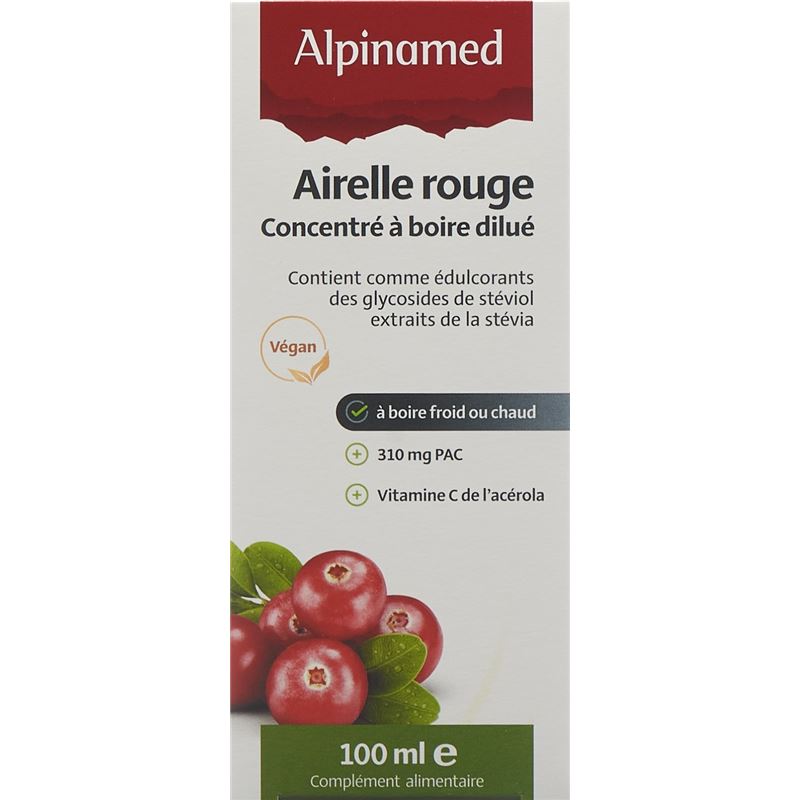 Preiselbeer-Extrakt-Konzentrat 72,2% (Herkunft Preiselbeeren: nördliches Europa), Moosbeeren-Extrakt-Konzentrat 25,1% (Herkunft Moosbeeren: nördliches Europa), Acerola; Verdickungsmittel: Johannisbrotkernmehl; Süssungsmittel: Steviol Glykoside aus Stevia;