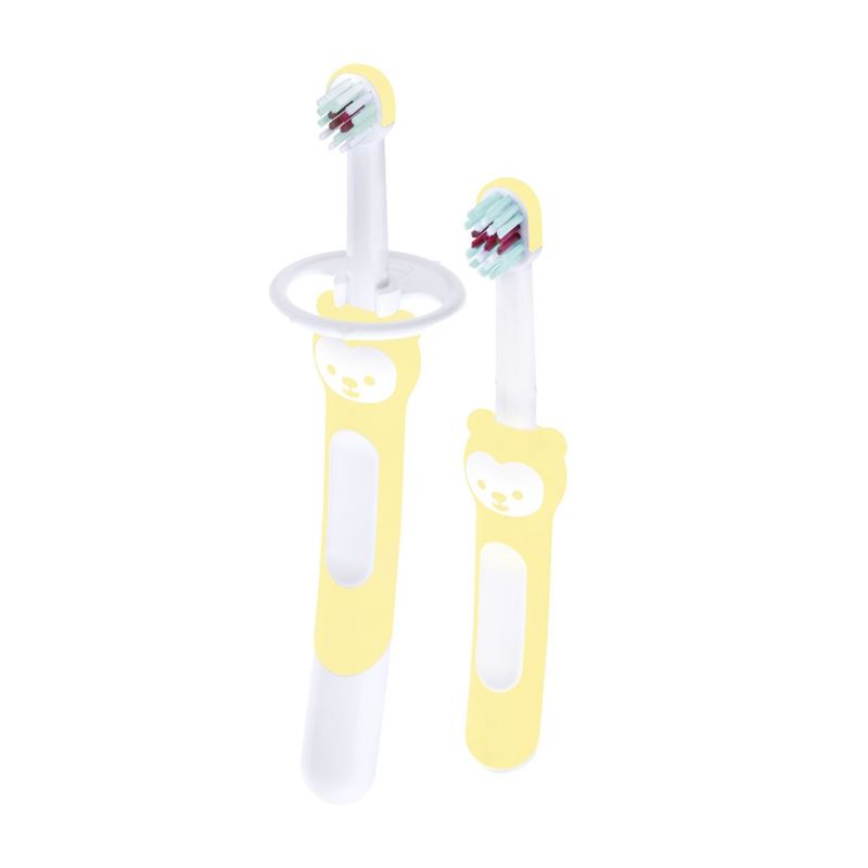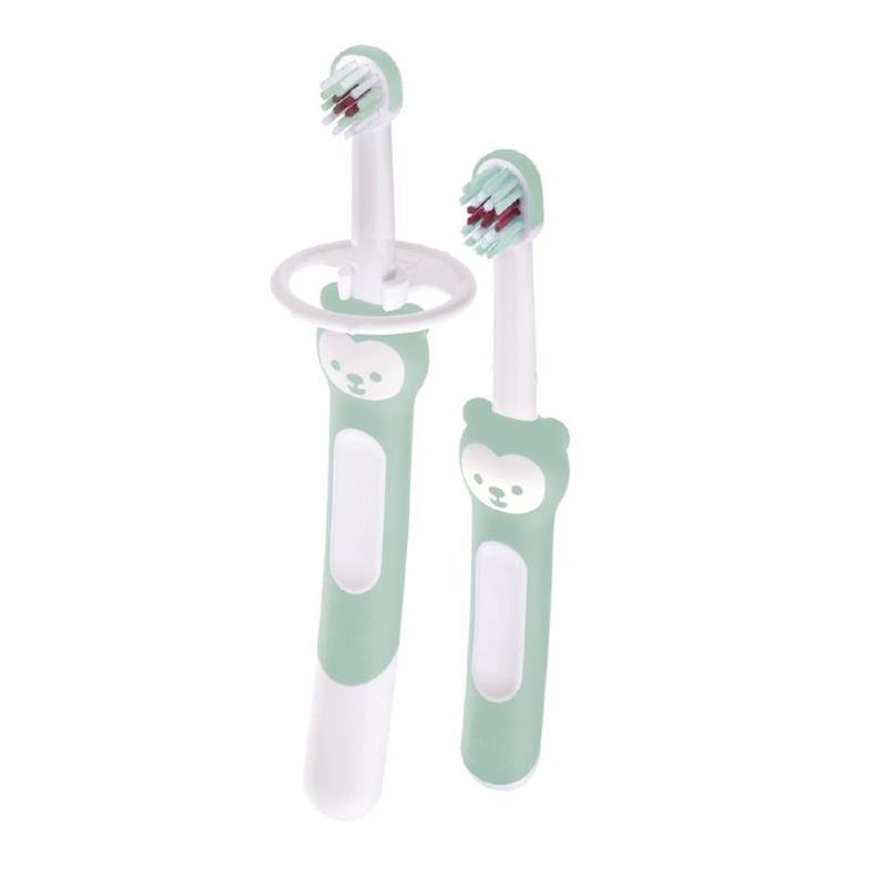 Mit dem Learn to Brush Set bestehend aus MAM Training Brush und MAM Baby's Brush lernen Babys von Anfang an richtig ihre Zähne zu putzen.