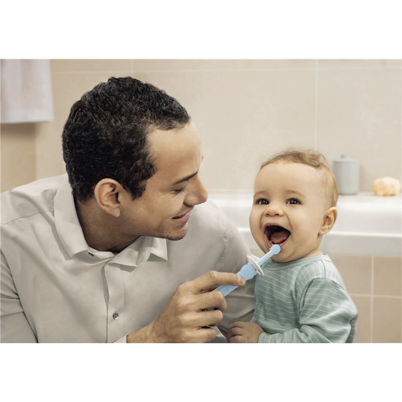 Mit Sicherheitsschild, um die Bürste in sicherer Distanz zu Babys Rachen zu halten.