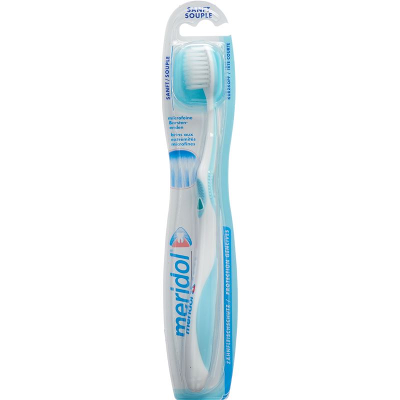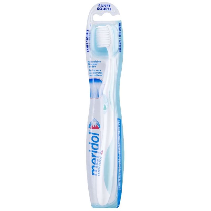 Die meridol Zahnfleischschutz Sanft Zahnbürste punktet mit ihren pinselartigen, mikrofeinen Borstenenden, die Speisereste und Plaque sanft und gründlich von der Oberfläche der Zähne bis hin zum Zahnfleischsaum entfernen.