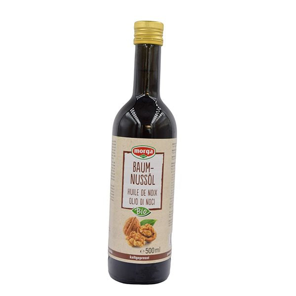 Dieses 100% naturreine Oel aus Baumnüssen weist einen hohen Gehalt an Omega-3-Fettsäuren auf und eignet sich für Salate und Rohkost. Nicht fritieren. Kaltgepresste MORGA-Oele sind sehr geschmacksintensiv, deshalb sparsam verwenden.