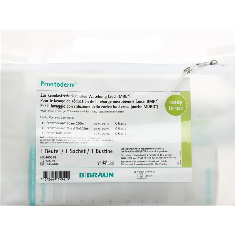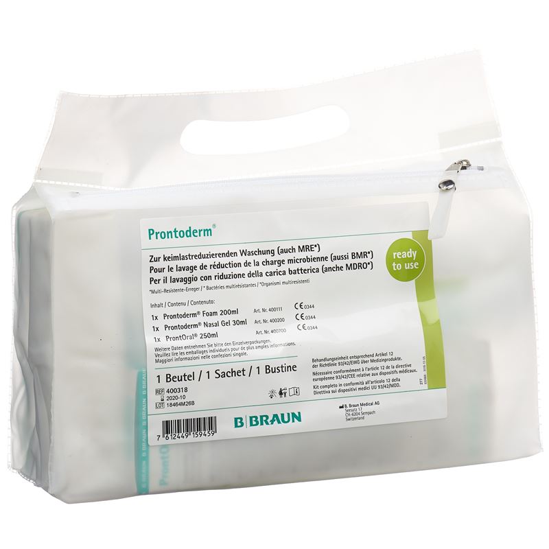 Entählt: 1x 200ml Prontoderm Foam für Haut, Schleimhaut und Haare, 1x 30ml Prontoderm Nasal Gel, 1x 250ml ProntOral.