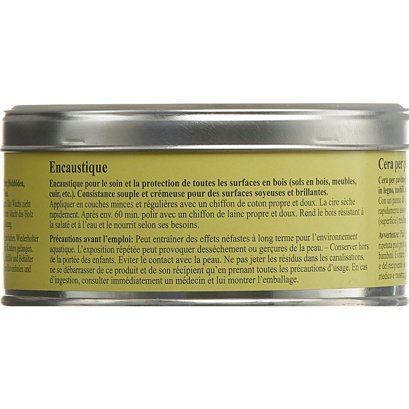 Bodenwachs zur Pflege und zum farblosen Schutz von allen Holzoberflächen (Holzböden, Möbel, Leder usw.). Weiche, cremige Masse für seidig glänzende Oberflächen. Macht das Holz widerstandsfähig gegen Schmutz und Wasser und gibt ihm wieder die nötige Nahrung.